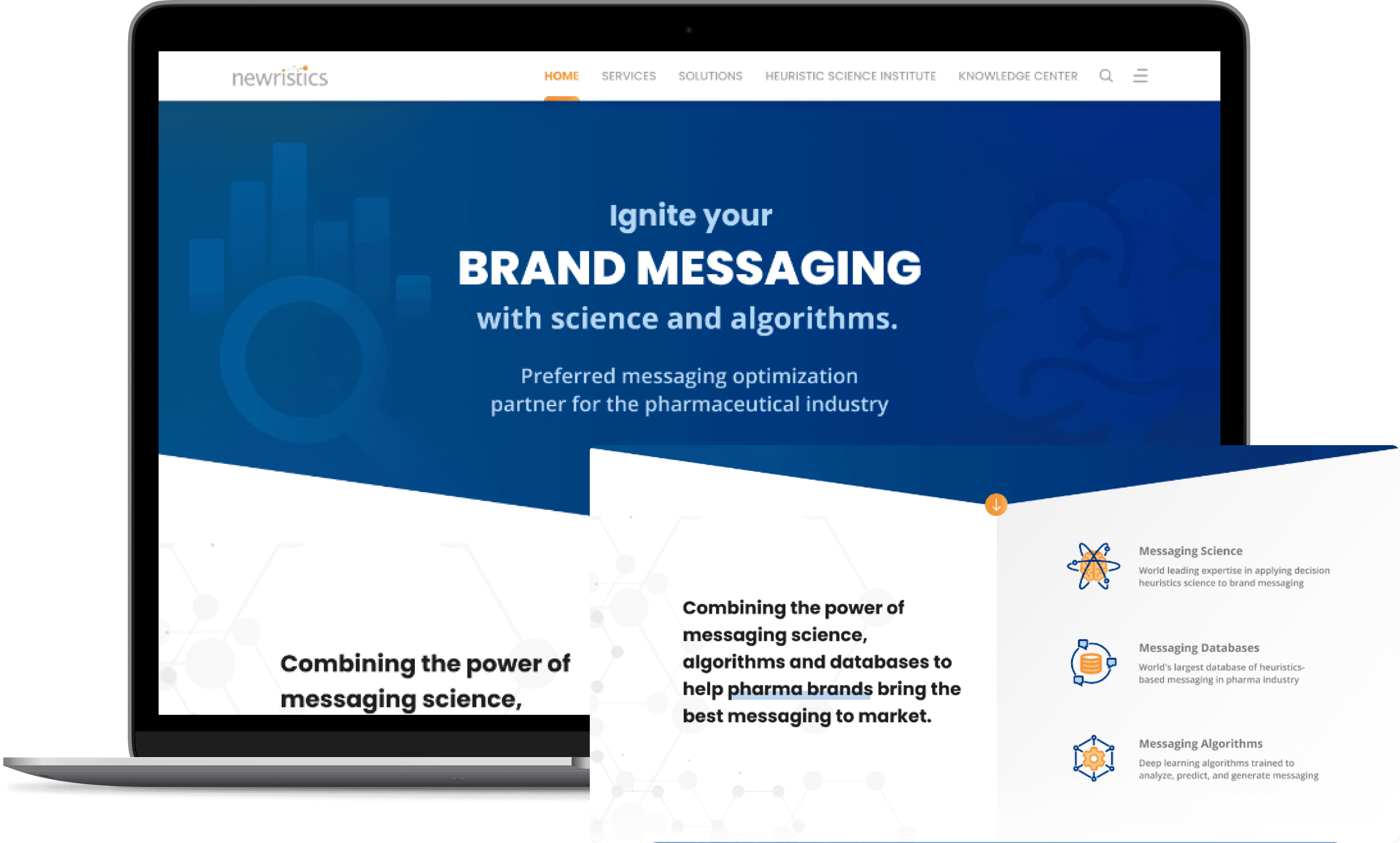 Introducing Newristics as a market research and content optimization brand for pharmaceutical companies. The first three panels highlight the pillars (Messaging Science, Messaging Database & Messaging Algorithm) that define Newristics' use of their enormous database of messages and heuristics to optimize brand messaging using AI instantly. They also illustrate three services provided by them.