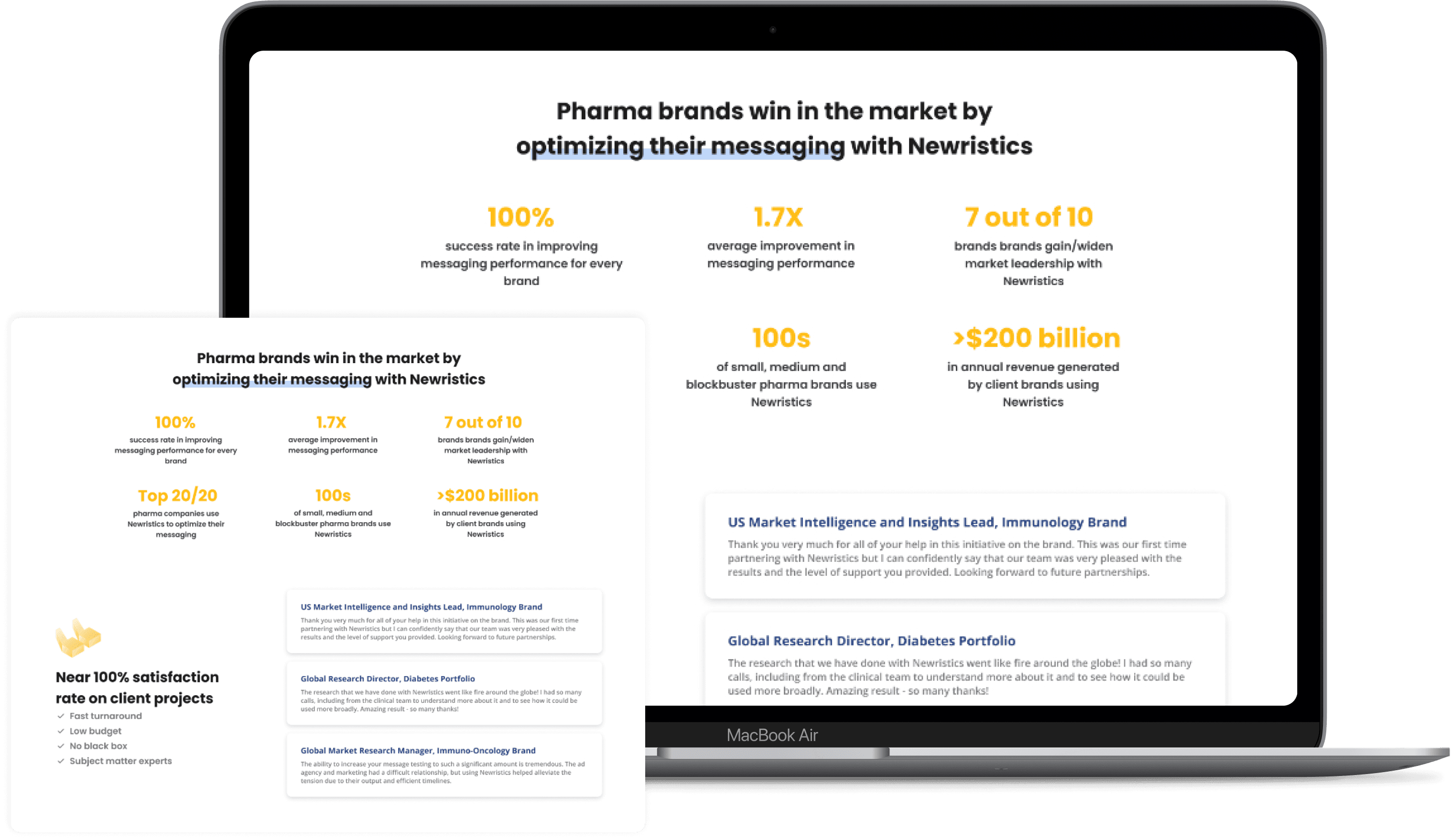 Apart from the three goals, we added sections that would make the company seem trustworthy and show off their expertise in the chosen domain. A claims panel that brags the results newristics has been able to achieve so far followed by a testimonial section to display the reliability of the company. Due to legal bindings, we were not able to display company names and logos, hence we went with the designation and brand type instead.