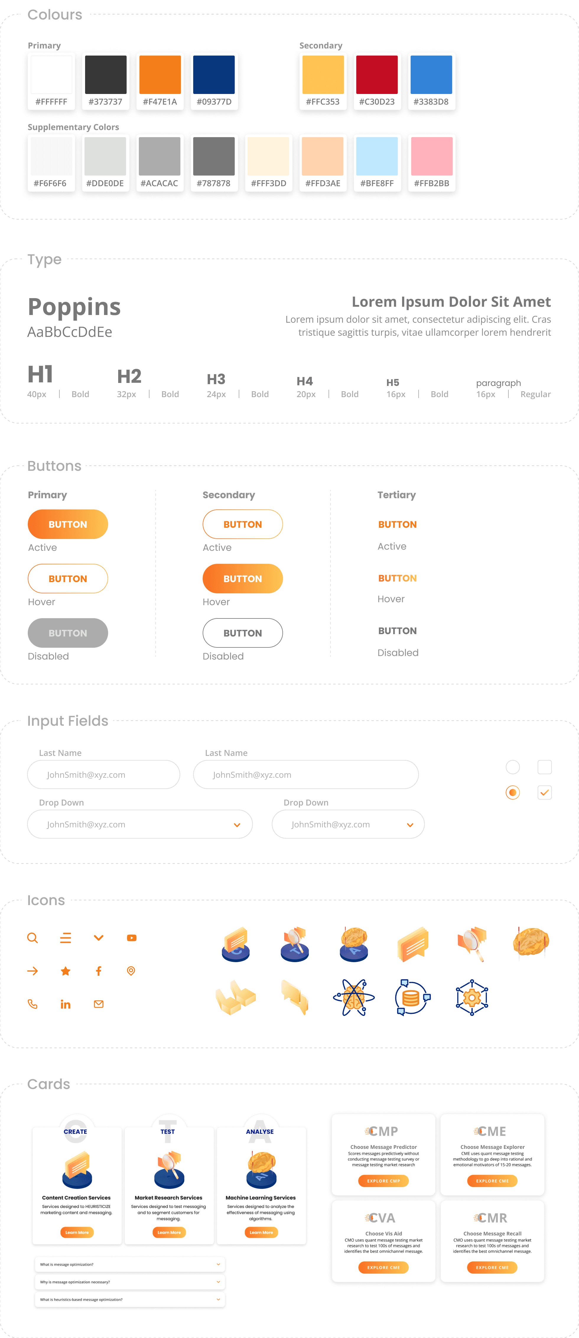 A design system was created to make the UI more uniform when executing future projects. Colors, typography, iconography, and cards were defined to make development seamless. Frequently used elements, such as FAQs, modals, pop-ups, and other content cards, were standardized since they appear on multiple pages. This improved consistency across the interface, enhanced user experience, and saved time in development by providing reusable components.