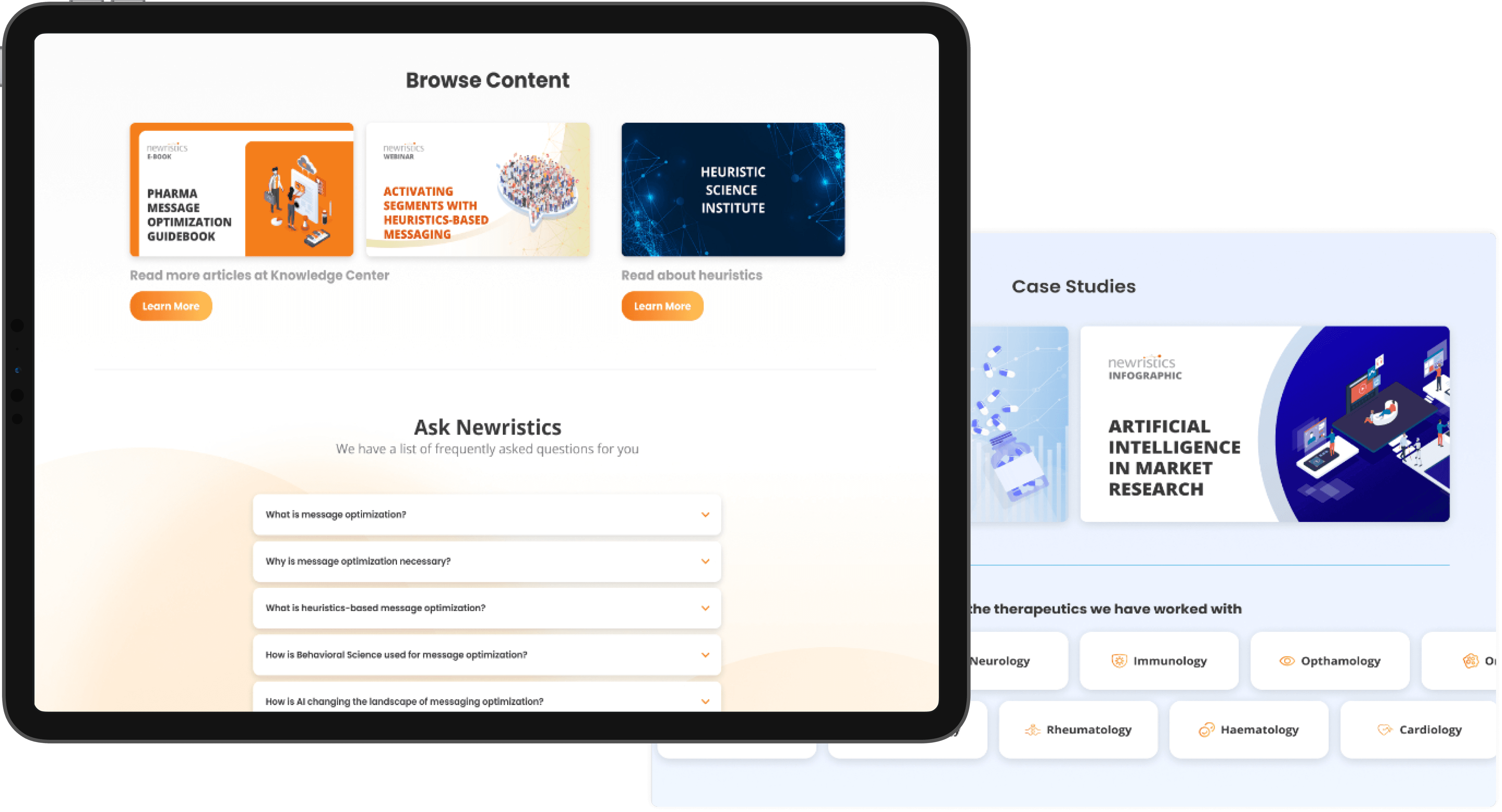 I designed a new marketing website for Newristics with restructured sections and navigation. The website illustrated Newristics' USPs while targeting pharma marketing professionals. Different use-cases and solutions are introduced in conjunction to Newristics' products.